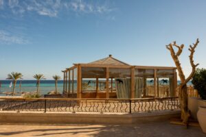 Der Yoga Pavillon liegt leicht erhöht, mit traumhaftem Blick aufs türkis-blaue Rote Meer